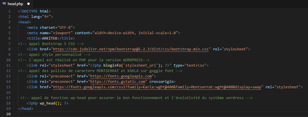 C'est habituel que le fichier de head charge des ressources externes comme Bootstrap et Google Fonts. Cependant, ces ressources sont souvent chargées via des actions WordPress hookées à wp_enqueue_scripts plutôt que directement dans le fichier head.php. Cela permet de gérer les dépendances et d'optimiser le chargement des scripts et des styles.